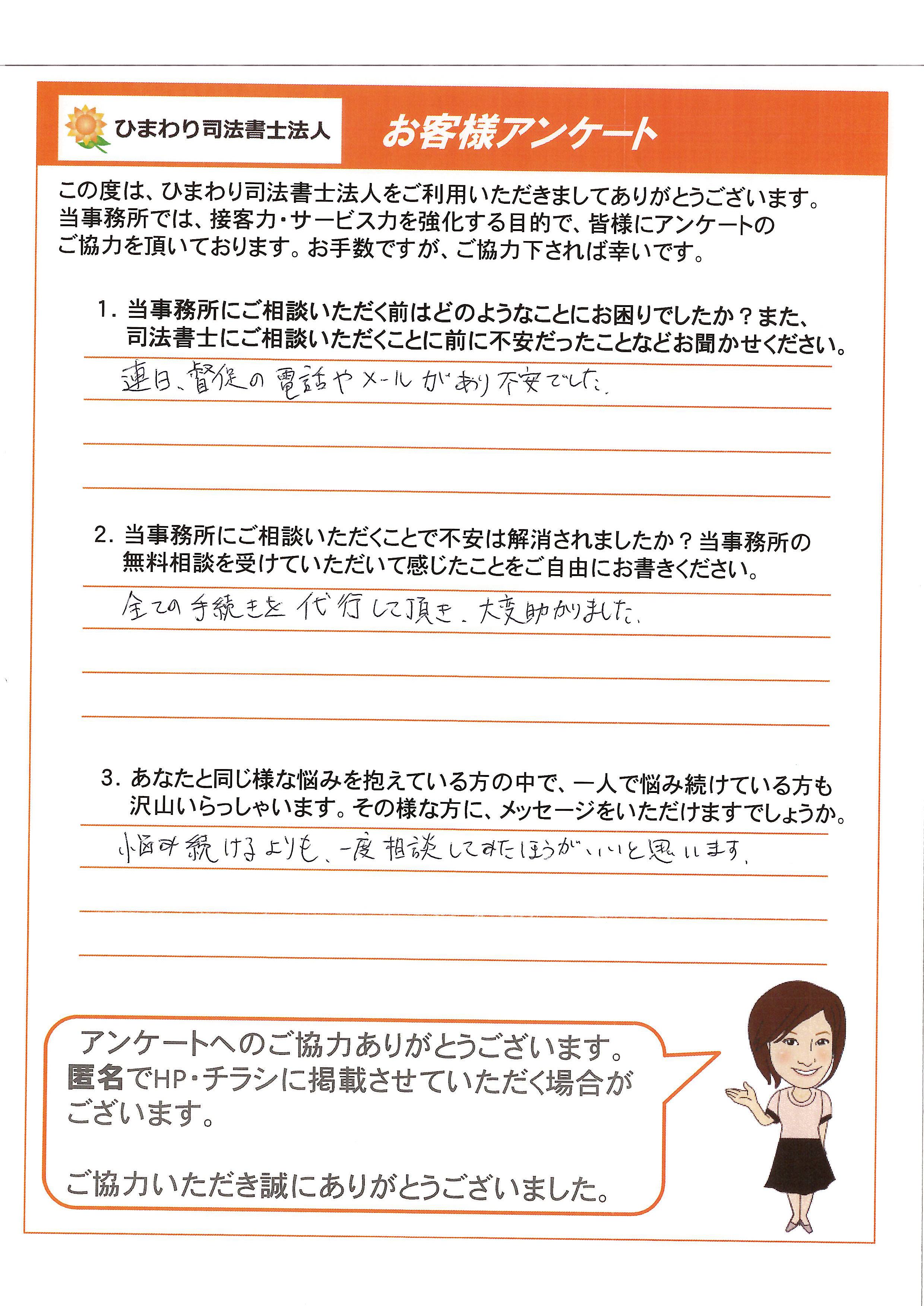 不安の多い手続きではありますが、こちらの事務所であれば安心してお任せできると感じております。これからもどうぞよろしくお願いいたします。