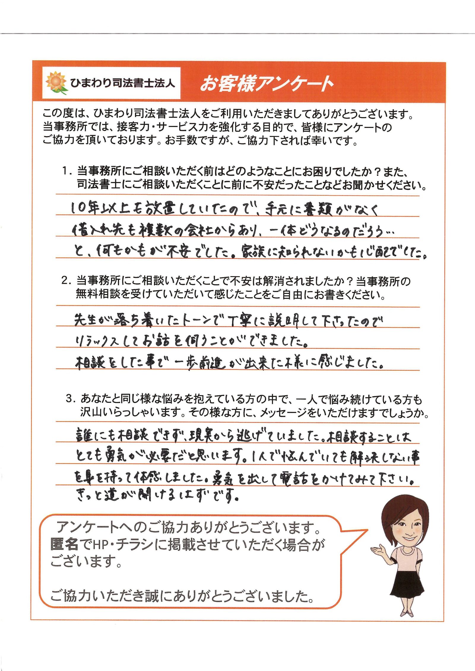 10年以上も放置していたので、手元に書類がなく借入れ先も複数の会社からあり、一体どうなるのだろう・・・と、何もかもが不安でした。
