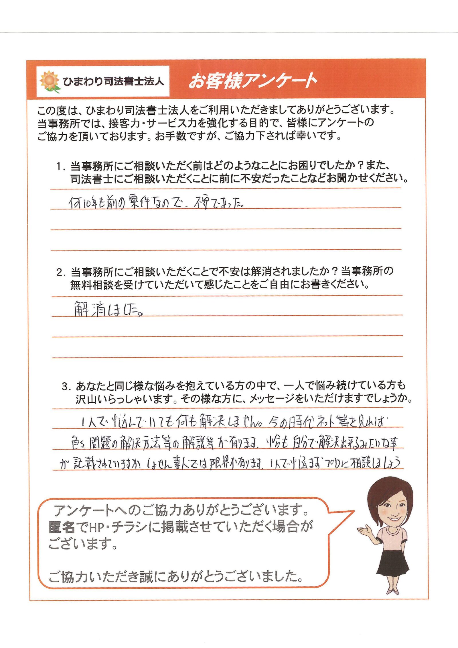 当事務所にご相談いただくことで不安は解消されましたか?当事務所の無料相談を受けていただいて感じたことをご自由にお書きください。