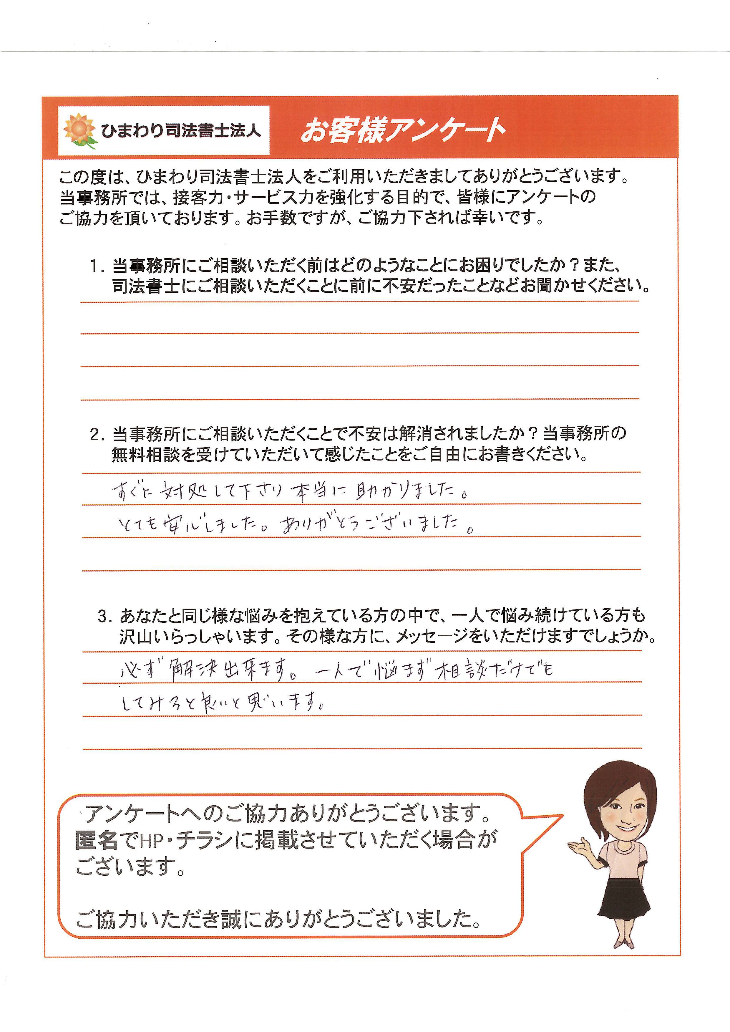 不安の多い手続きではありますが、こちらの事務所であれば安心してお任せできると感じております。これからもどうぞよろしくお願いいたします。